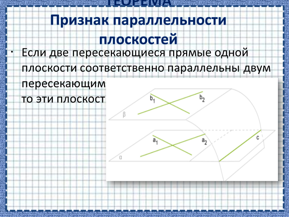 Если две пересекающиеся прямые одной плоскости соответственно параллельны двум пересекающимся прямым другой плоскости, то эти плоскости параллельны.