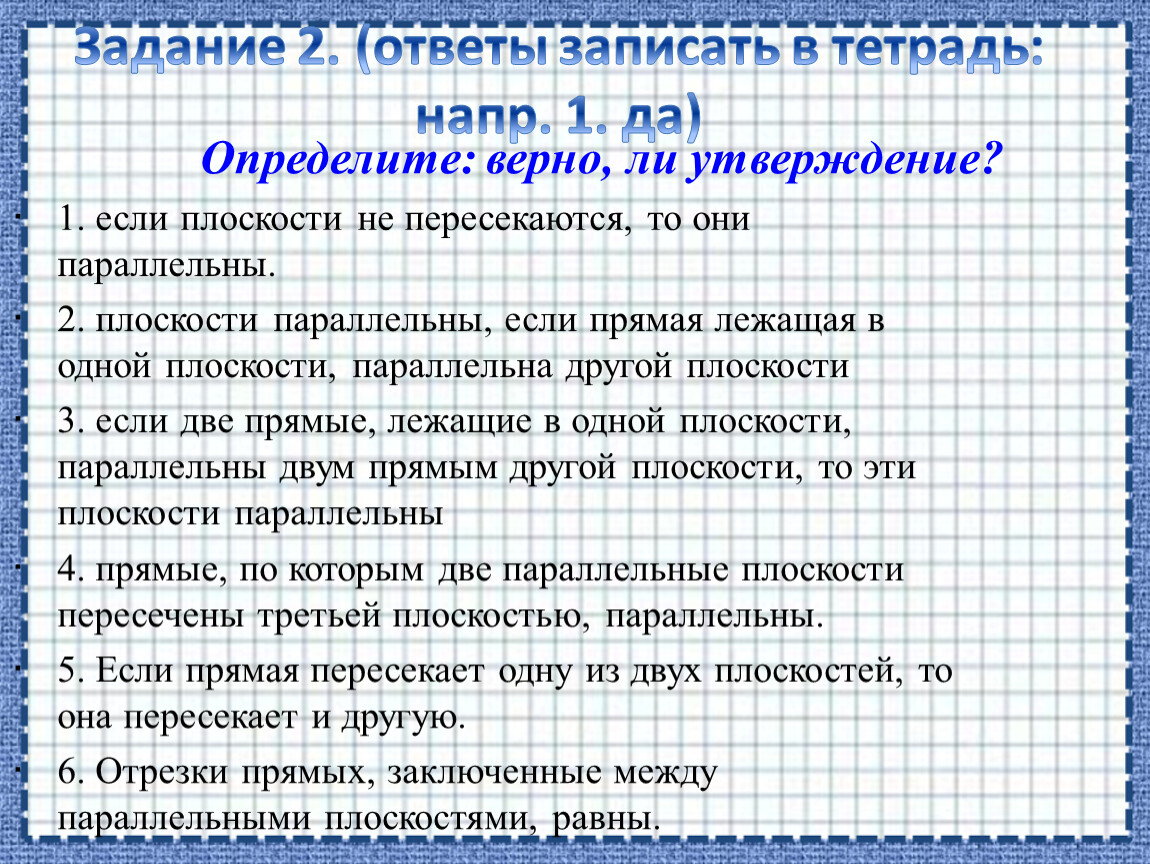 Задание 2. (ответы записать в тетрадь: напр. 1. да)