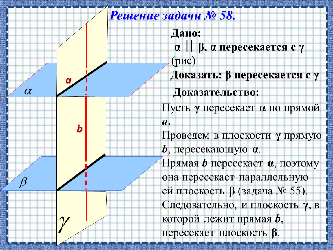 Следовательно, и плоскость γ, в которой лежит прямая b, пересекает плоскость β.