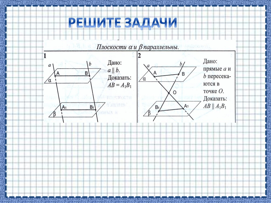 3. если две прямые, лежащие в одной плоскости, параллельны двум прямым другой плоскости, то эти плоскости параллельны