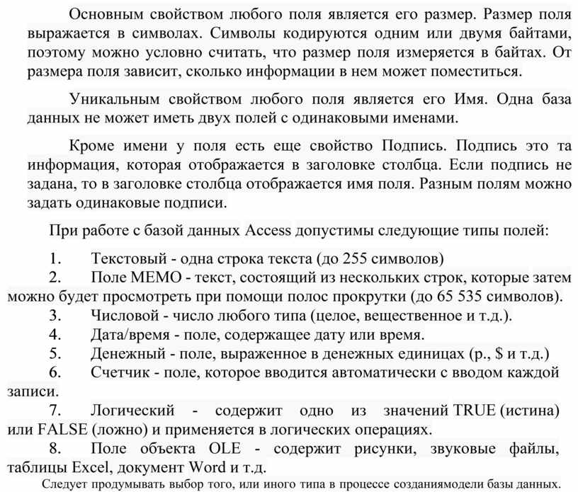 Основным свойством любого поля является его размер. Размер поля выражается в символах. Символы кодируются одним или двумя байтами, поэтому можно условно считать, что размер поля измеряется в байтах. От размера поля зависит, сколько информации в нем может поместиться.