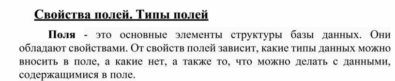 Поля - это основные элементы структуры базы данных. Они обладают свойствами. От свойств полей зависит, какие типы данных можно вносить в поле, а какие нет, а также то, что можно делать с данными, содержащимися в поле.