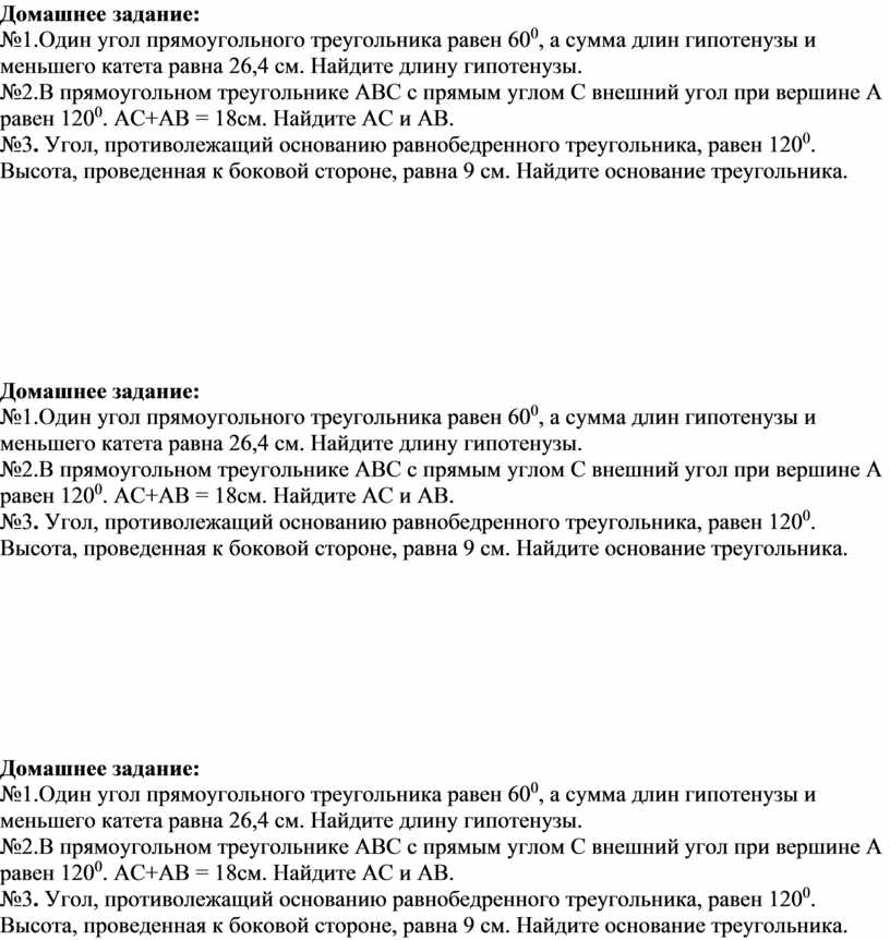 №1.Один угол прямоугольного треугольника равен 600, а сумма длин гипотенузы и меньшего катета равна 26,4 см. Найдите длину гипотенузы.