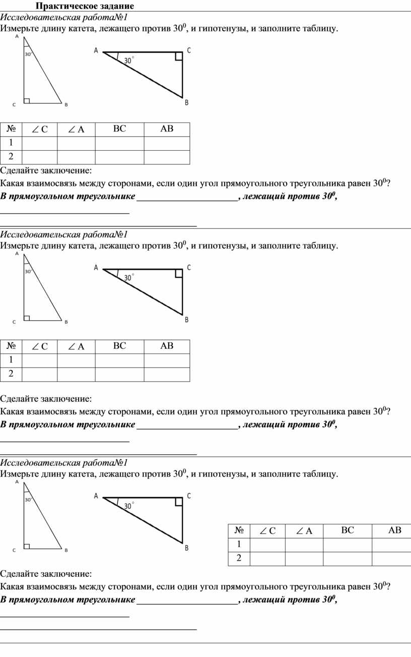 Исследовательская работа№1 Измерьте длину катета, лежащего против 300, и гипотенузы, и заполните таблицу.