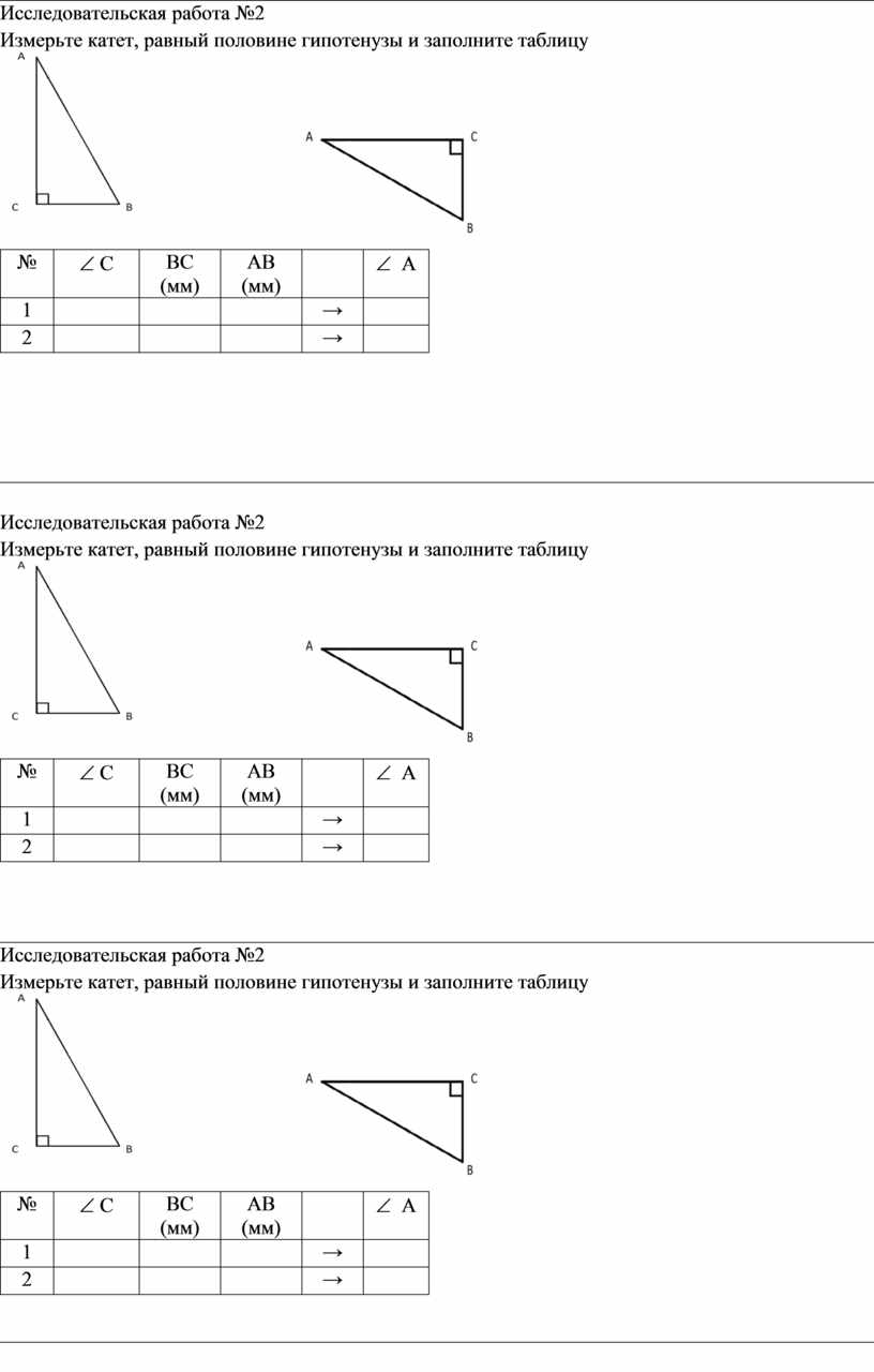 Исследовательская работа №2 Измерьте катет, равный половине гипотенузы и заполните таблицу