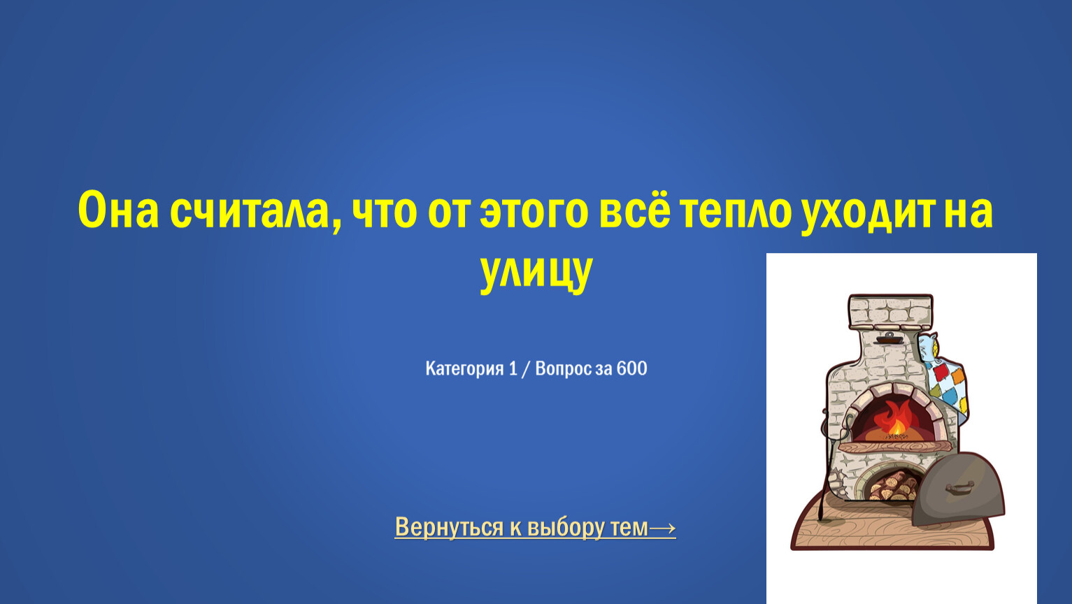 Она считала, что от этого всё тепло уходит на улицуКатегория 1 / Вопрос за 600
