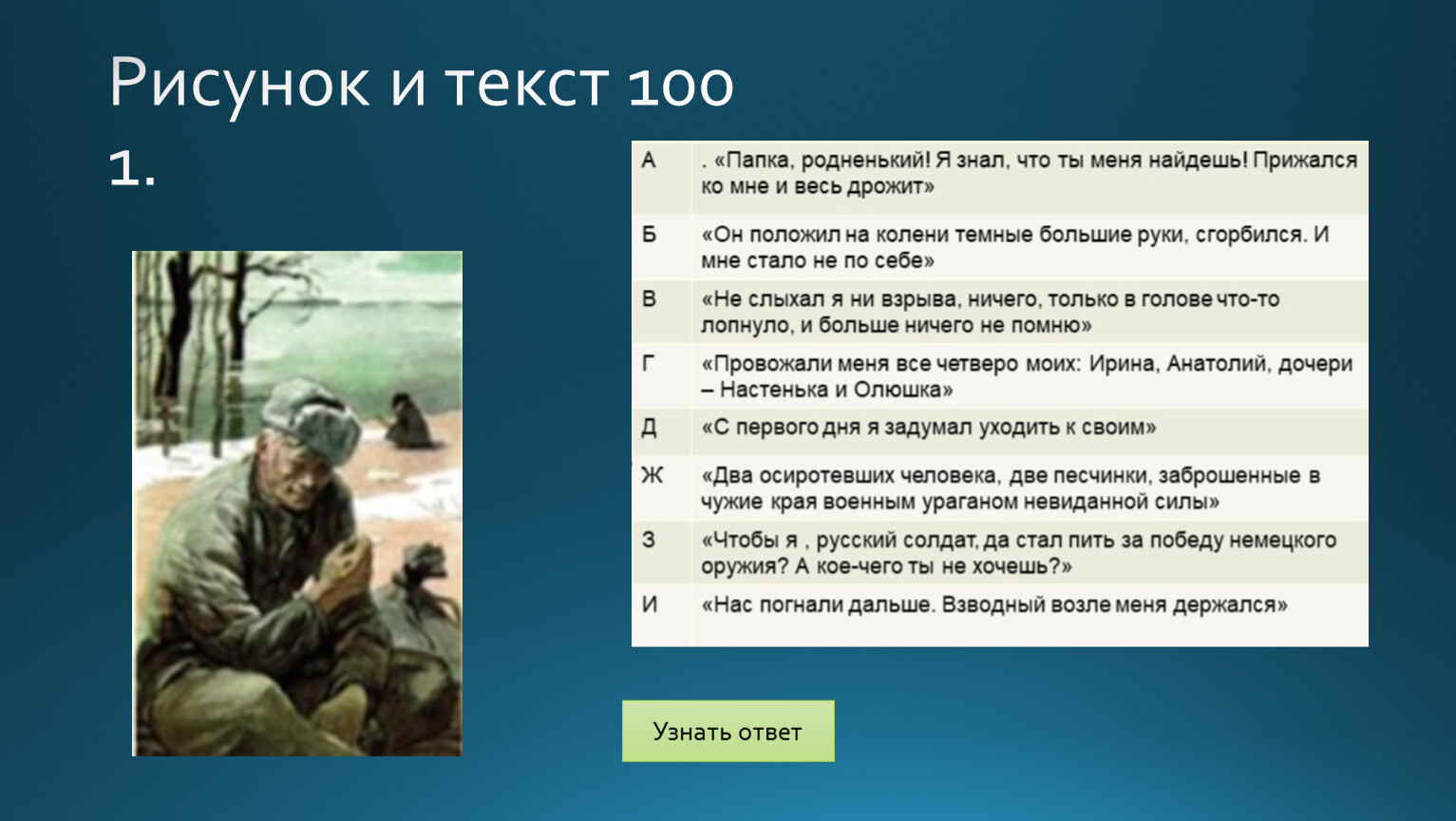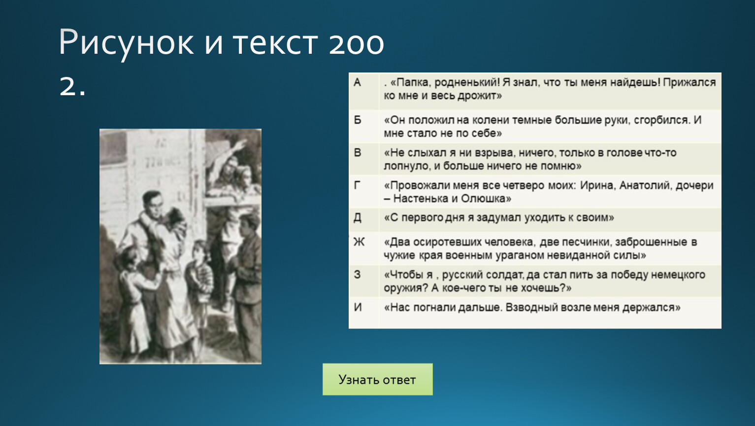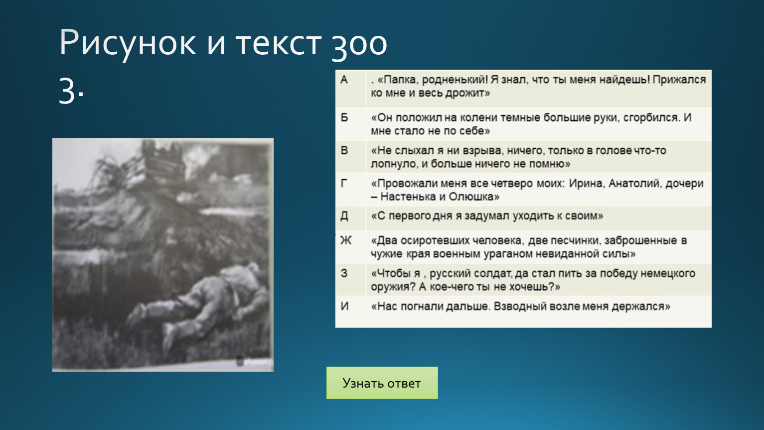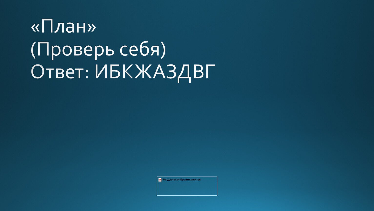 «План»Поставь по порядку события повестиА. Соколов в плену. Встреча с комендантом Мюллером.Б. Проводы Соколова на фронт.В. Смерть сына от немецкого снайпера 9 мая 1945 года и его похороны.Г. Встреча с Ванюшей.Д. Известие о гибели семьи из Воронежа. Отпуск в Воронеж.Ж. Ночь в церкви и убийство предателя.З. Побег из плена на машине.И. Встреча на переправе автора и Соколова с Ваней.К. Бомбежка и взятие в плен Соколова.