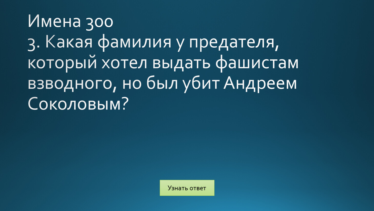 Имена 3003. Какая фамилия у предателя, который хотел выдать фашистам взводного, но был убит Андреем Соколовым?