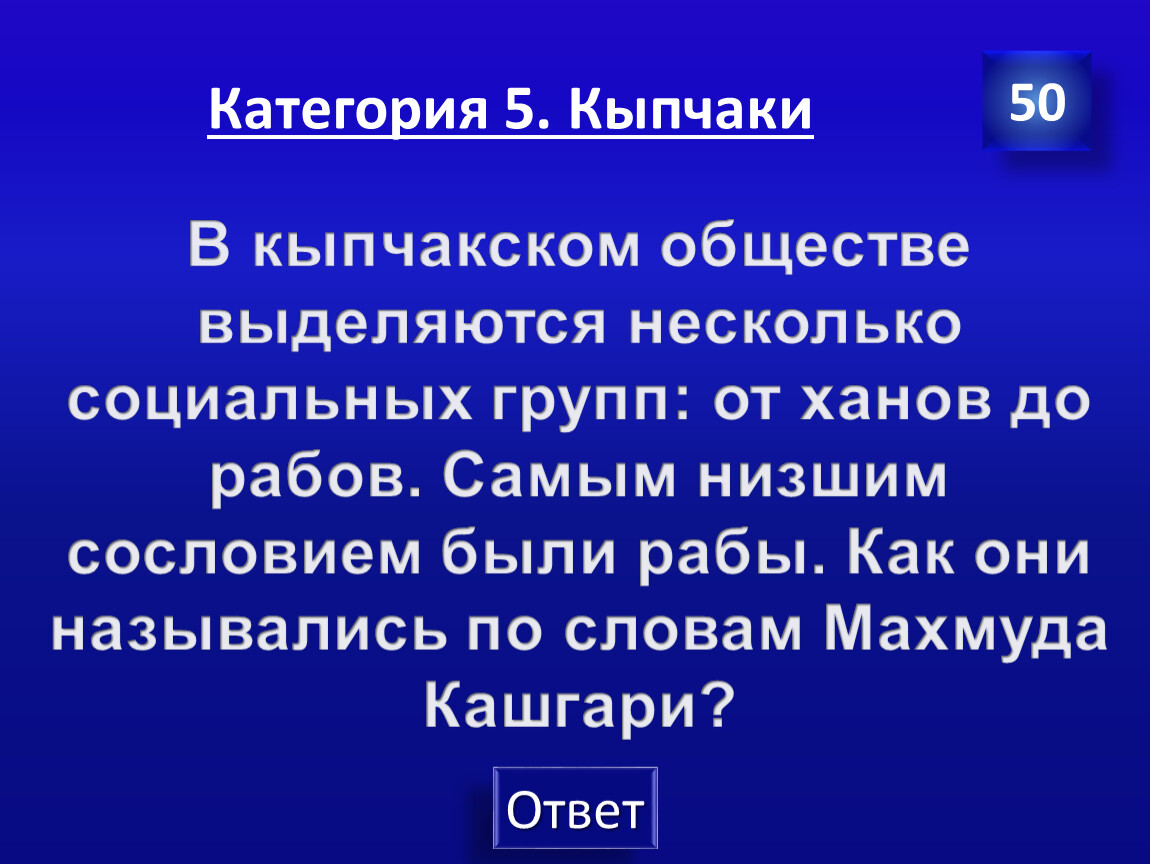 В кыпчакском обществе выделяются несколько социальных групп: от ханов до рабов. Самым низшим сословием были рабы. Как они назывались по словам Махмуда Кашгари?