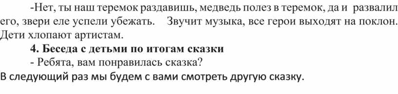 -Нет, ты наш теремок раздавишь, медведь полез в теремок, да и развалил его, звери еле успели убежать. Звучит музыка, все герои выходят на поклон. Дети хлопают артистам.