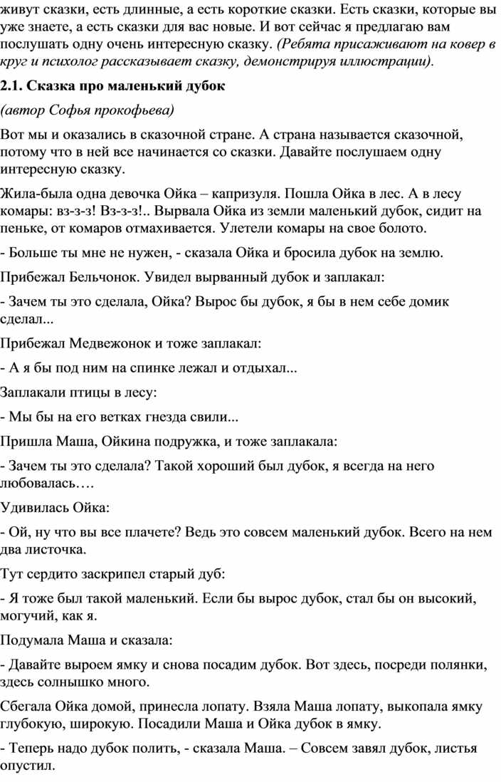 Психолог. Вот мы ребята с вами оказались в Сказочной стране. А почему она так называется, как вы думаете? (Ребята дают свои ответы) В этой стране живут сказки, есть длинные, а есть короткие сказки. Есть сказки, которые вы уже знаете, а есть сказки для вас новые. И вот сейчас я предлагаю вам послушать одну очень интересную сказку. (Ребята присаживают на ковер в круг и психолог рассказывает сказку, демонстрируя иллюстрации).