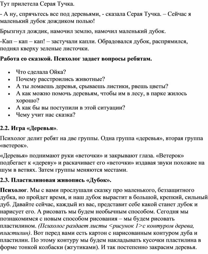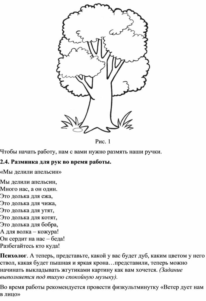 Психолог. Мы с вами прослушали сказку про маленького, беззащитного дубка, но пройдет время, и наш дубок вырастит в большой, крепкий, сильный дуб. Давайте сейчас, каждый из вас, представит себе какой станет дубок и нарисует его. А рисовать мы будем необычным способом. Сегодня мы познакомимся с новым способом рисования – мы будем рисовать пластилином. (Психолог раздает листы <рисунок 1>с контуром дерева, пластилин). Вот перед вами есть картон с нарисованным контуром дуба и пластилин. По этому контуру мы будем накладывать кусочки пластилина в форме тонкой колбаски (жгутиками). И так постепенно закрасим деревья.
