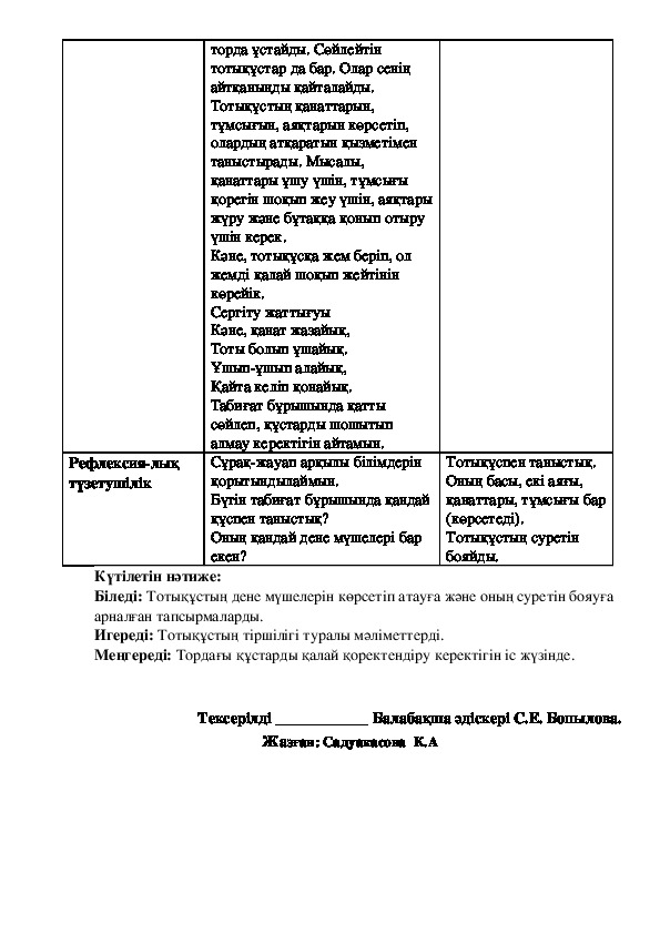 Тақырыбы: «Табиғат бұрышындағы құстарды бақылау.Тотықұс»