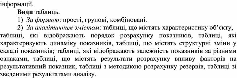 2) За аналітичним змістом: таблиці, що містять характеристику об’єкту,
