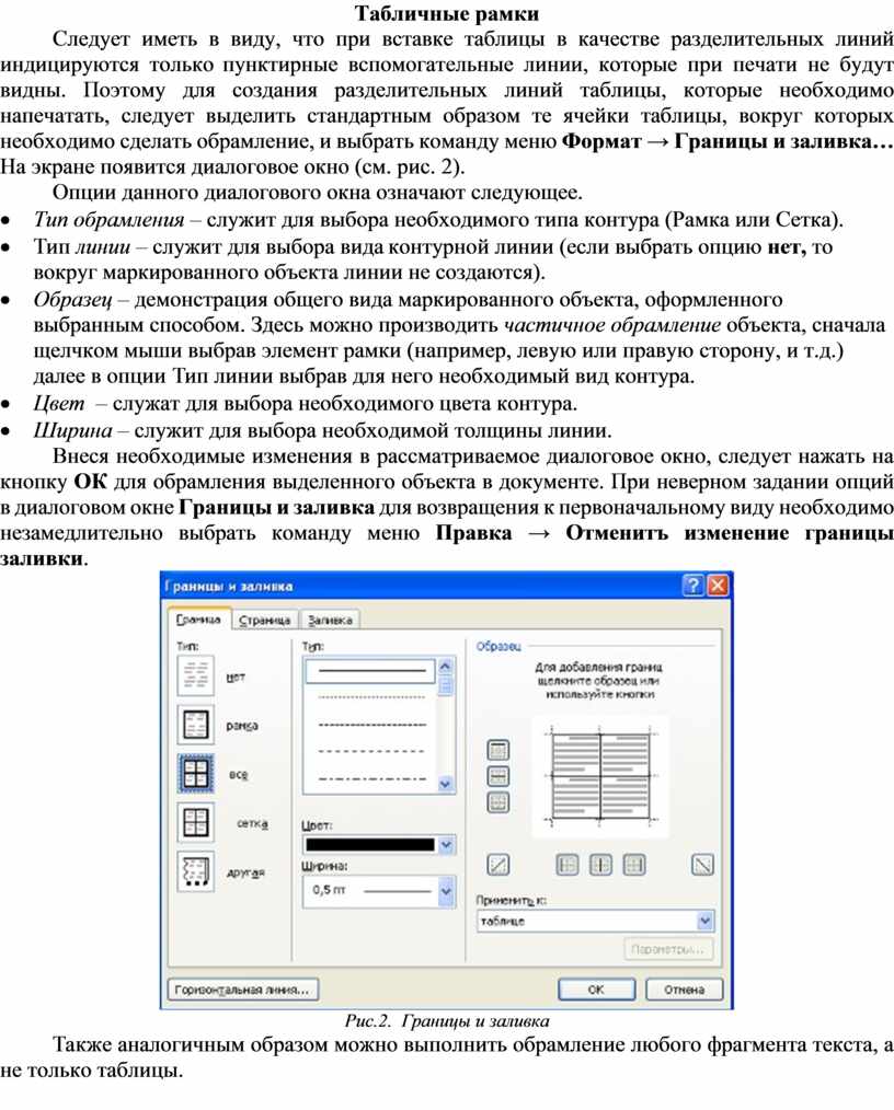 Следует иметь в виду, что при вставке таблицы в качестве разделительных линий индицируются только пунктирные вспомогательные линии, которые при печати не будут видны. Поэтому для создания разделительных линий таблицы, которые необходимо напечатать, следует выделить стандартным образом те ячейки таблицы, вокруг которых необходимо сделать обрамление, и выбрать команду меню Формат → Границы и заливка… На экране появится диалоговое окно (см. рис. 2).