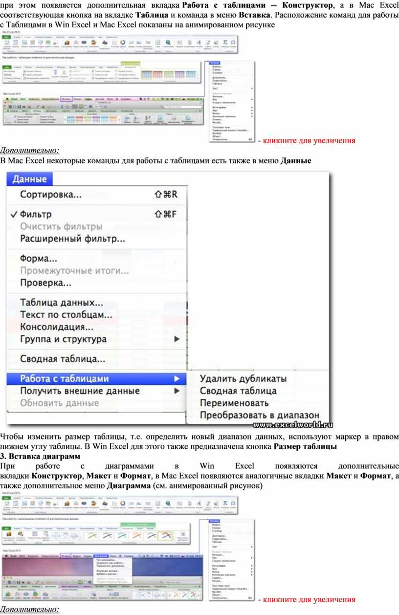 Дополнительно: · В Mac Excel нет понятия Сводных диаграмм · Mac Excel не работает со срезами · Кнопка Дополнительные вычисления в Win Excel дублирует соответствующую команду в диалоговом окне Параметры поля, в Mac Excel дополнительные вычисления доступны только через окно Параметры поля · Mac Excel не работает со средствами OLAP 2. Вставка Таблиц Оформление диапазона данных с помощью инструмента Таблица открывает ряд дополнительных возможностей, например, автоматическое распространение формул при добавлении записей, формирование строки итогов, создание диаграмм с динамическим добавлением данных. Чтобы оформить диапазон как Таблицу в Win Excel используется одноименная кнопка на вкладке Вставка, при этом появляется дополнительная вкладка Работа с таблицами -- Конструктор, а в Mac Excel соответствующая кнопка на вкладке Таблица и команда в меню Вставка. Расположение команд для работы с Таблицами в Win Excel и Mac Excel показаны на анимированном рисунке