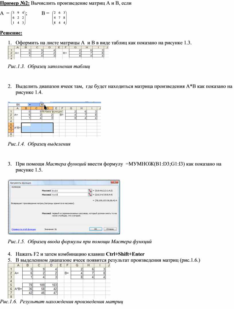 5. В выделенном диапазоне ячеек появится результат произведения матриц (рис.1.6.)