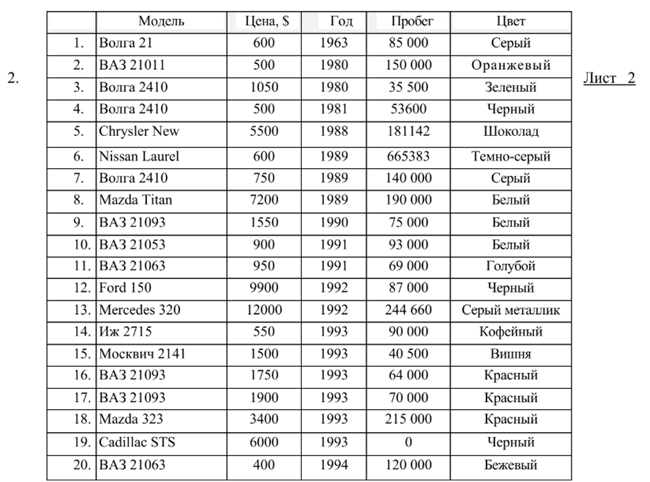 3. Лист З переименуйте в Цена, скопируйте таблицу с листа Автомобили. Проведите по столбцу Цена сортировку по убыванию. Обратите внимание, что значение по строкам остается неизменным, например, для модели Волга 21 цена, год, пробег и цвет не меняются, независимо от того, на какой позиции в списке эта модель.