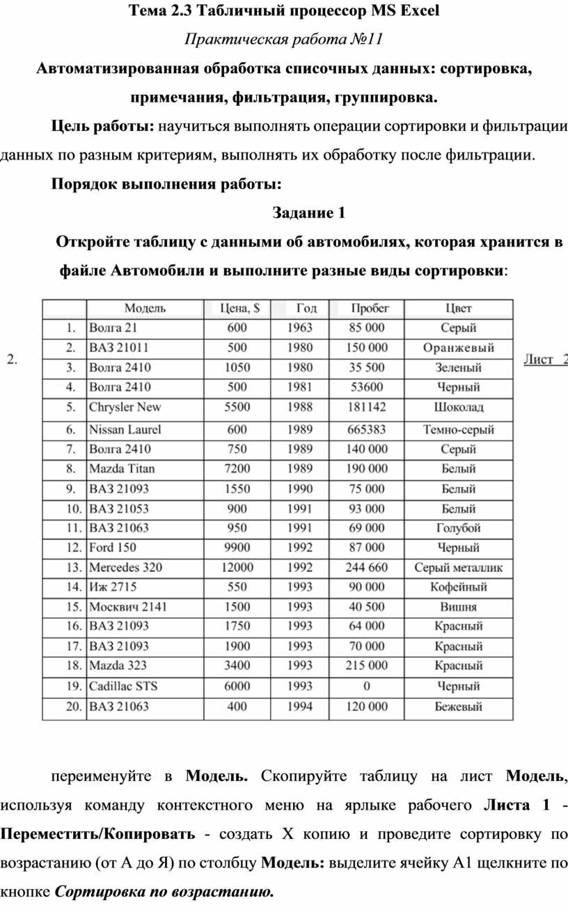 переименуйте в Модель. Скопируйте таблицу на лист Модель, используя команду контекстного меню на ярлыке рабочего Листа 1 - Переместить/Копировать - создать X копию и проведите сортировку по возрастанию (от А до Я) по столбцу Модель: выделите ячейку А1 щелкните по кнопке Сортировка по возрастанию.