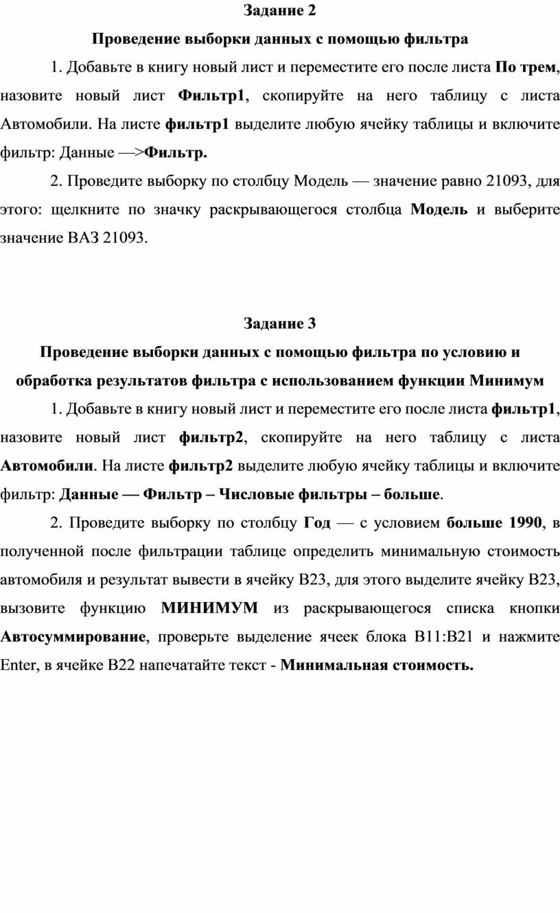 2. Проведите выборку по столбцу Год — с условием больше 1990, в полученной после фильтрации таблице определить минимальную стоимость автомобиля и результат вывести в ячейку В23, для этого выделите ячейку В23, вызовите функцию МИНИМУМ из раскрывающегося списка кнопки Автосуммирование, проверьте выделение ячеек блока В11:B21 и нажмите Enter, в ячейке В22 напечатайте текст - Минимальная стоимость.