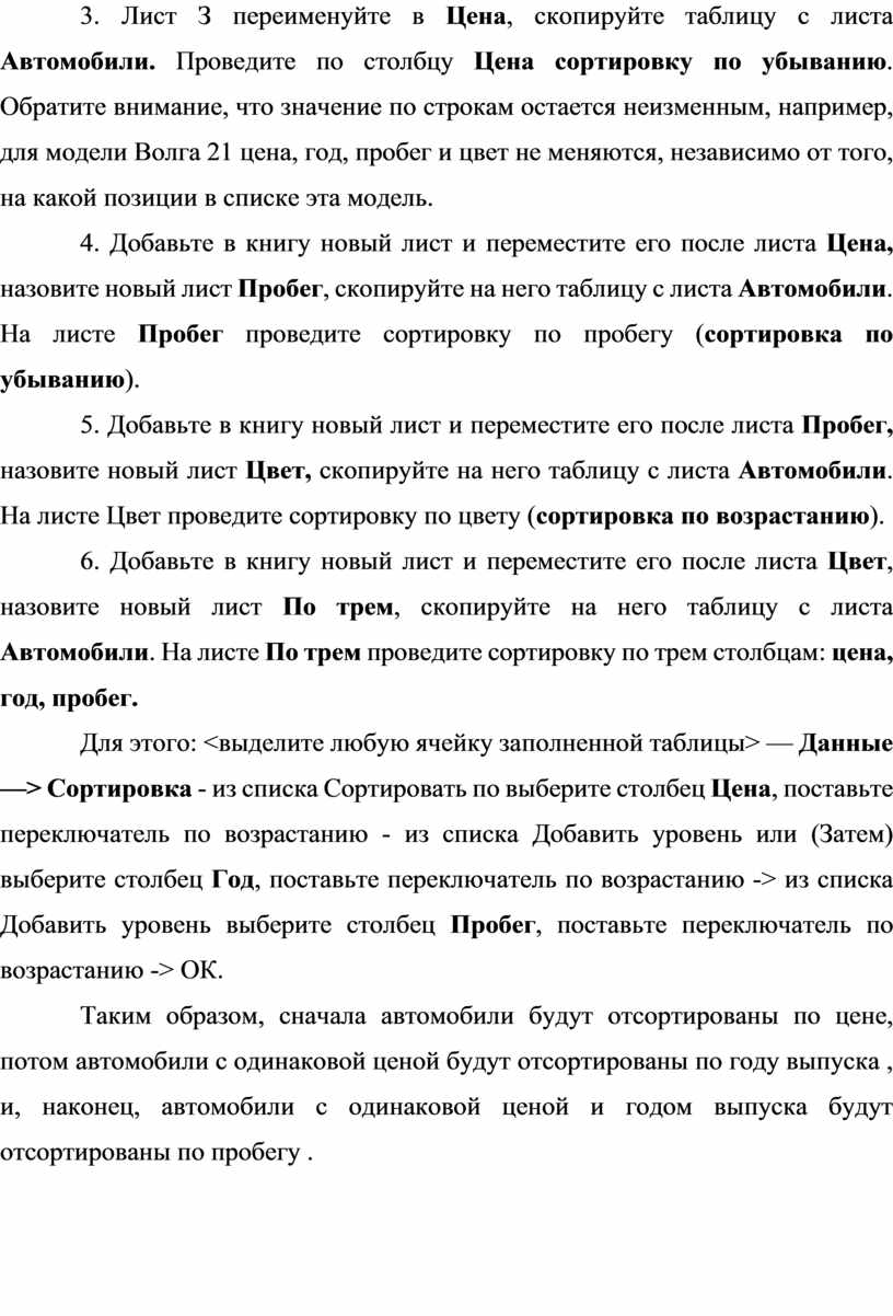 6. Добавьте в книгу новый лист и переместите его после листа Цвет, назовите новый лист По трем, скопируйте на него таблицу с листа Автомобили. На листе По трем проведите сортировку по трем столбцам: цена, год, пробег.