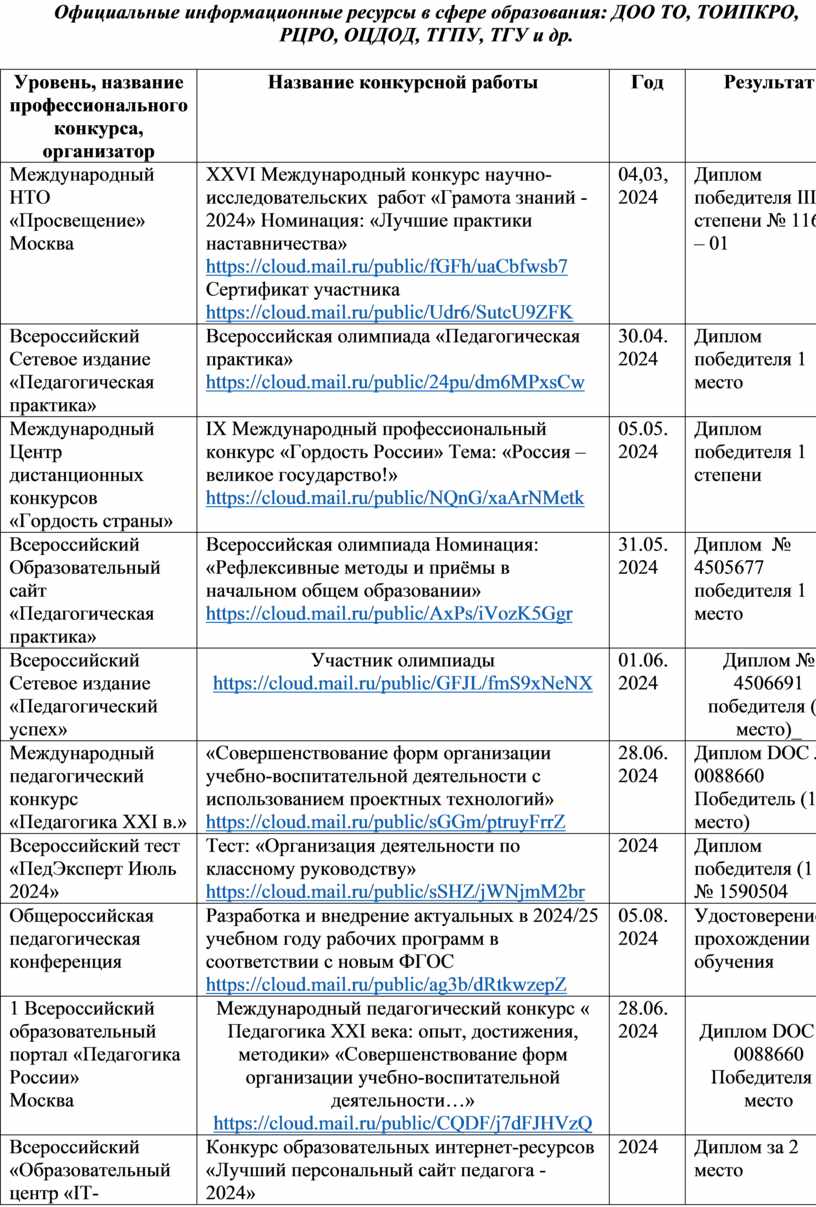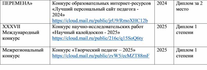 Конкурс образовательных интернет-ресурсов «Лучший персональный сайт педагога - 2024» https://cloud.mail.ru/public/jrU9/RmoXHC12b |