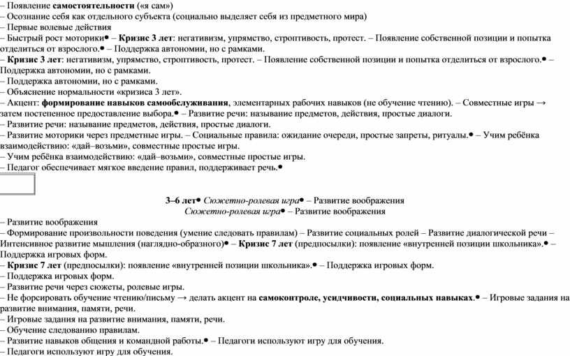 – Поддержка автономии, но с рамками. – Объяснение нормальности «кризиса 3 лет». – Акцент: формирование навыков самообслуживания, элементарных рабочих навыков (не обучение чтению). – Совместные игры → затем постепенное предоставление выбора. |