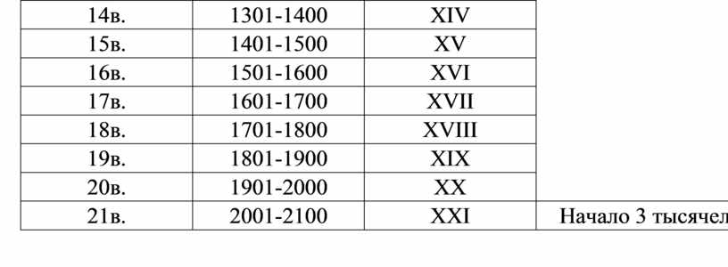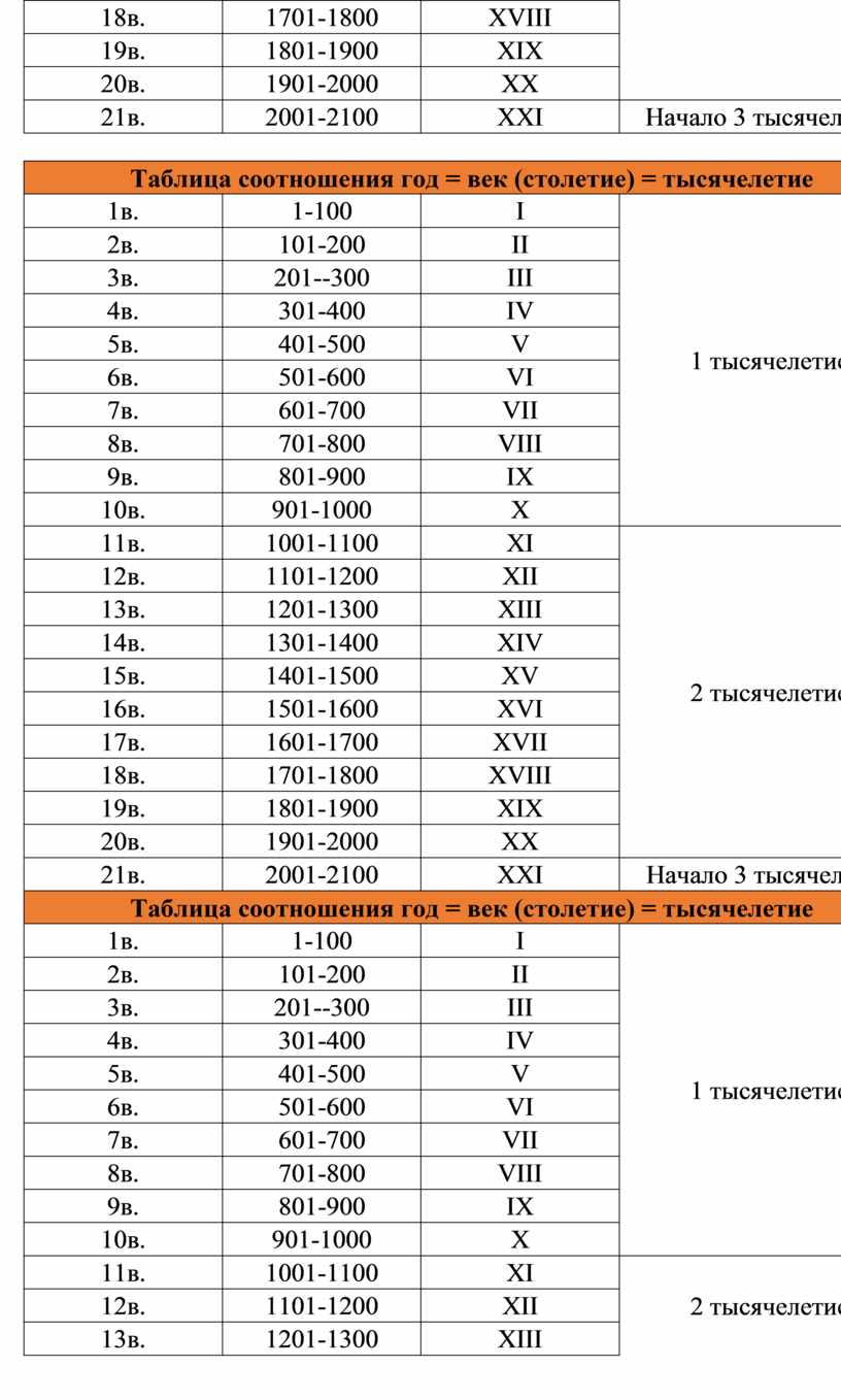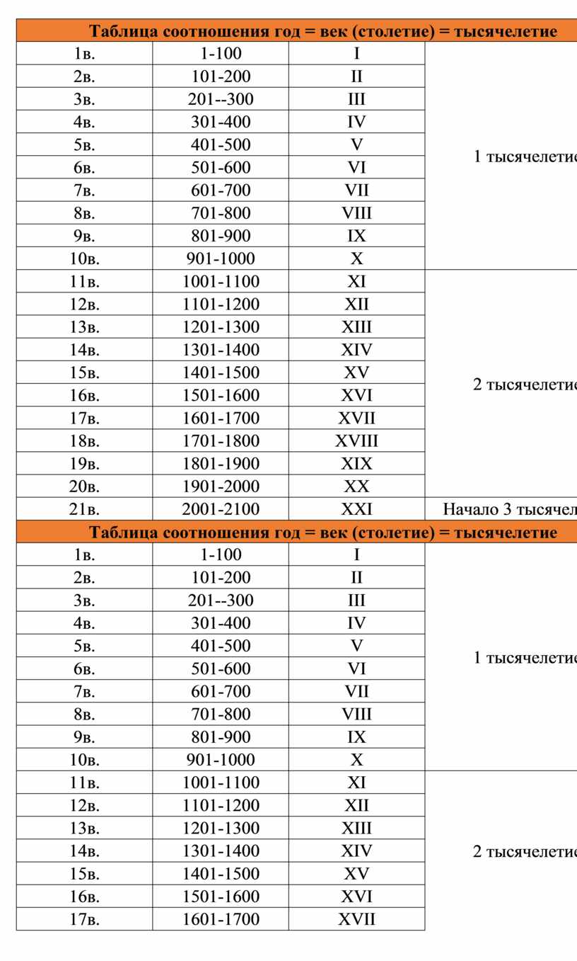 Таблица соотношения год = век (столетие) = тысячелетие |