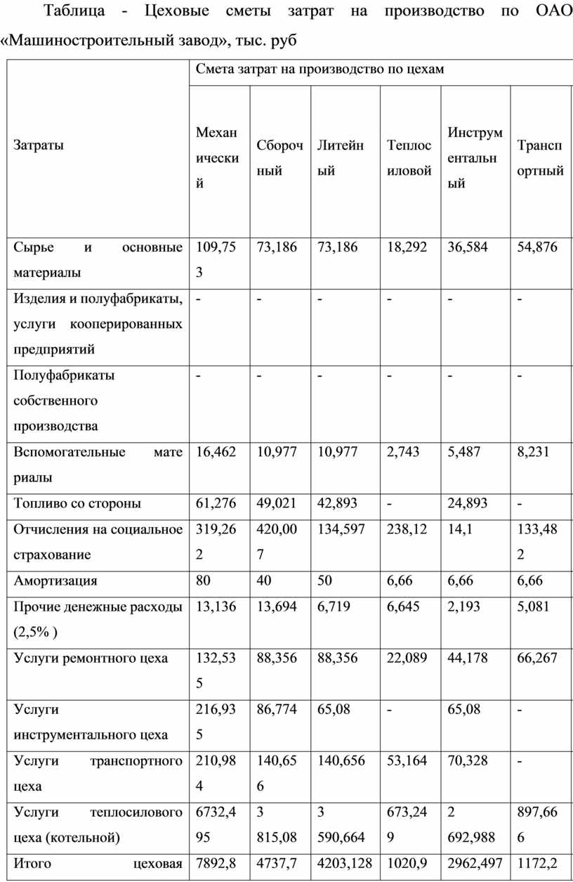 Таблица - Цеховые сметы затрат на производство по ОАО «Машиностроительный завод», тыс. руб