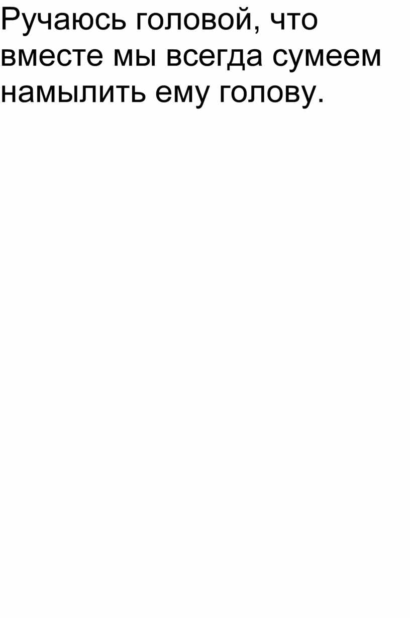 - Спору нет - горячая голова! Но уж если мы с ним сошлись, на свою голову, то теперь отвечаем за его поведение головой. Я ещё не знаю, что мы должны сделать в первую голову (у меня голова идёт кругом), но думаю, что голову вешать не стоит. Ручаюсь головой, что вместе мы всегда сумеем намылить ему голову.