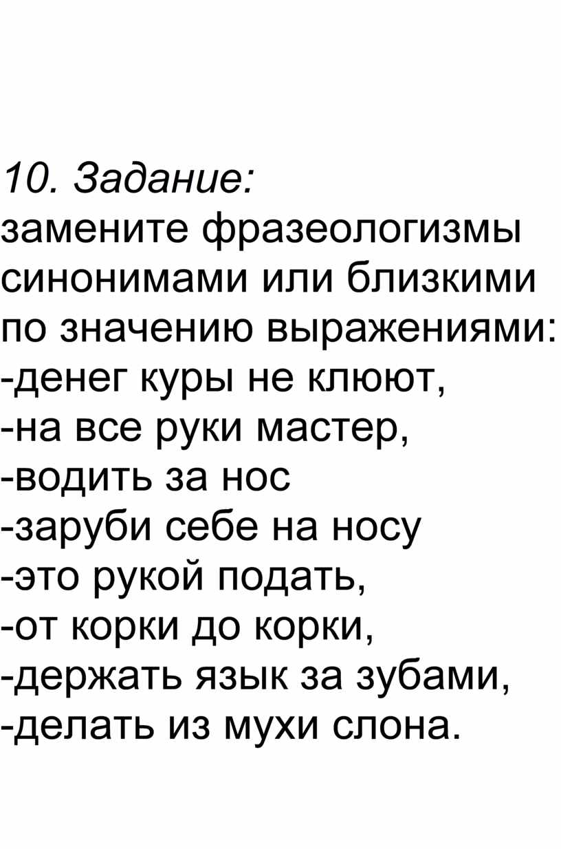 замените фразеологизмы синонимами или близкими по значению выражениями: