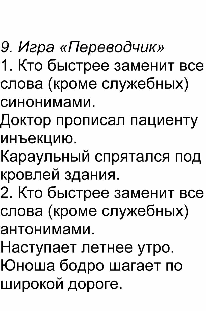 1. Кто быстрее заменит все слова (кроме служебных) синонимами.