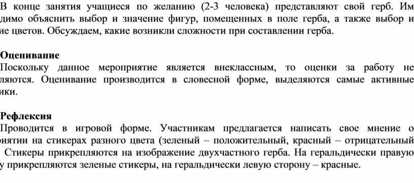 В конце занятия учащиеся по желанию (2-3 человека) представляют свой герб. Им необходимо объяснить выбор и значение фигур, помещенных в поле герба, а также выбор и значение цветов. Обсуждаем, какие возникли сложности при составлении герба.