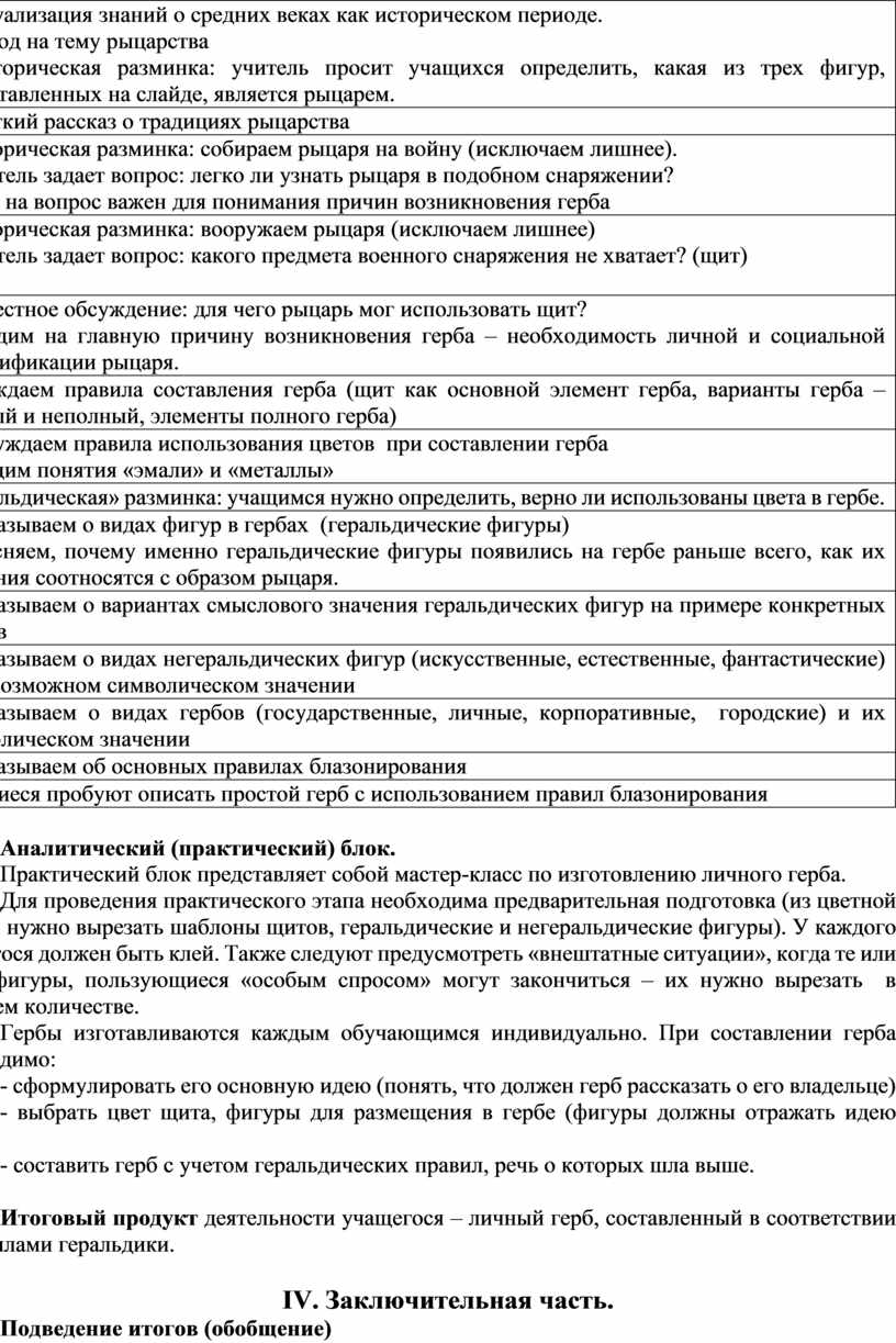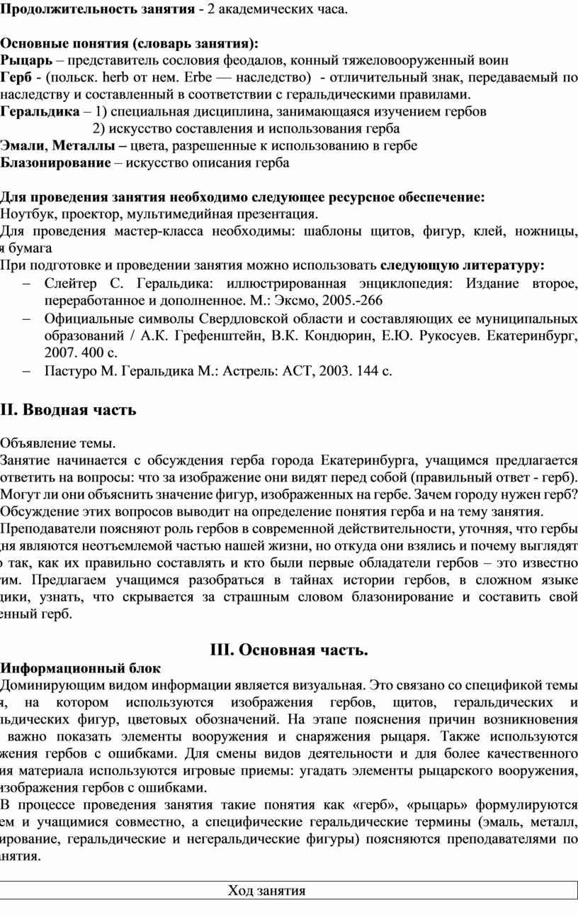 В процессе проведения занятия такие понятия как «герб», «рыцарь» формулируются учителем и учащимися совместно, а специфические геральдические термины (эмаль, металл, блазонирование, геральдические и негеральдические фигуры) поясняются преподавателями по ходу занятия.