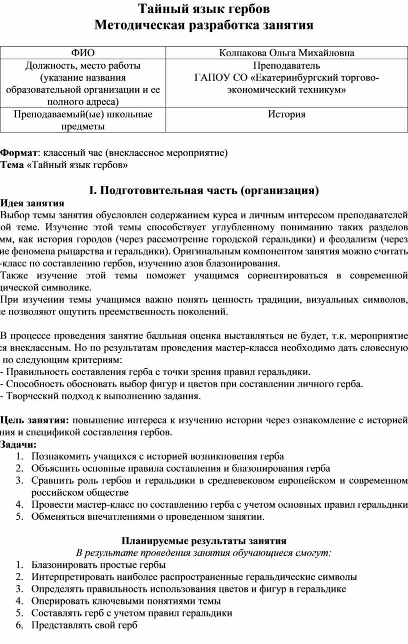 Выбор темы занятия обусловлен содержанием курса и личным интересом преподавателей к данной теме. Изучение этой темы способствует углубленному пониманию таких разделов программ, как история городов (через рассмотрение городской геральдики) и феодализм (через изучение феномена рыцарства и геральдики). Оригинальным компонентом занятия можно считать мастер-класс по составлению гербов, изучению азов блазонирования.