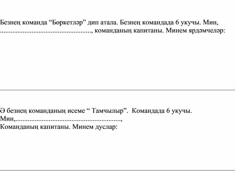 Безнең команда “Бөркетләр” дип атала. Безнең командада 6 укучы. Мин, ...................................................., команданың капитаны. Минем ярдәмчеләр:
