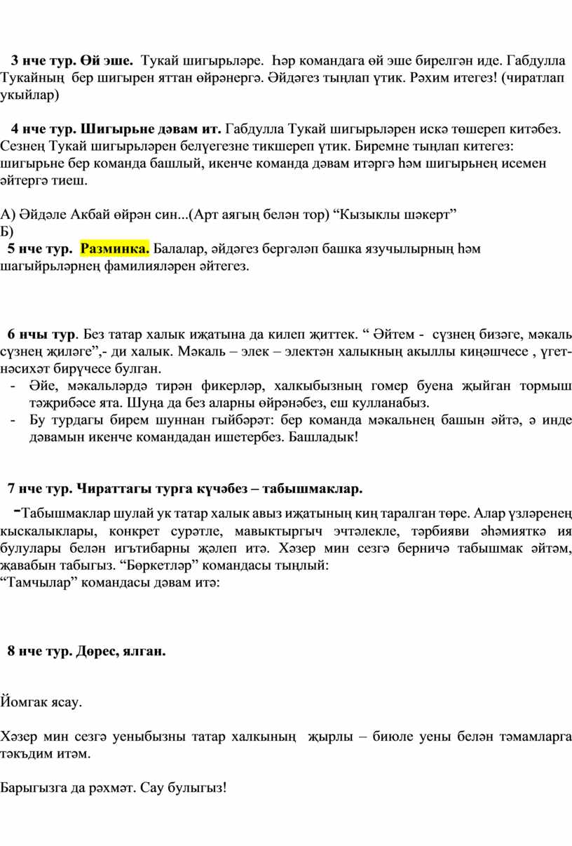 3 нче тур. Өй эше. Тукай шигырьләре. Һәр командага өй эше бирелгән иде. Габдулла Тукайның бер шигырен яттан өйрәнергә. Әйдәгез тыңлап үтик. Рәхим итегез! (чиратлап укыйлар)