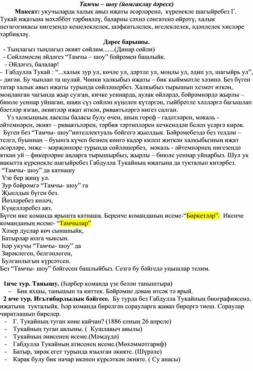 Бүген без “Тамчы- шоу”интеллектуаль бәйгегә җыелдык. Бәйрәмебездә без телдән – телгә, буыннан – буынга күчеп безнең көнгә кадәр килеп җиткән халкыбызның иҗат әсәрләре, энҗе – мәрҗәннәре турында сөйләшербез, мәкаль - әйтемнәрнең нигезендә яткан уй – фикерләрне аңларга тырышырбыз, җырлы – биюле уеннар уйнарбыз. Шул ук вакытта күренекле шагыйребез Габдулла Тукайның иҗатына да тукталып китәрбез.