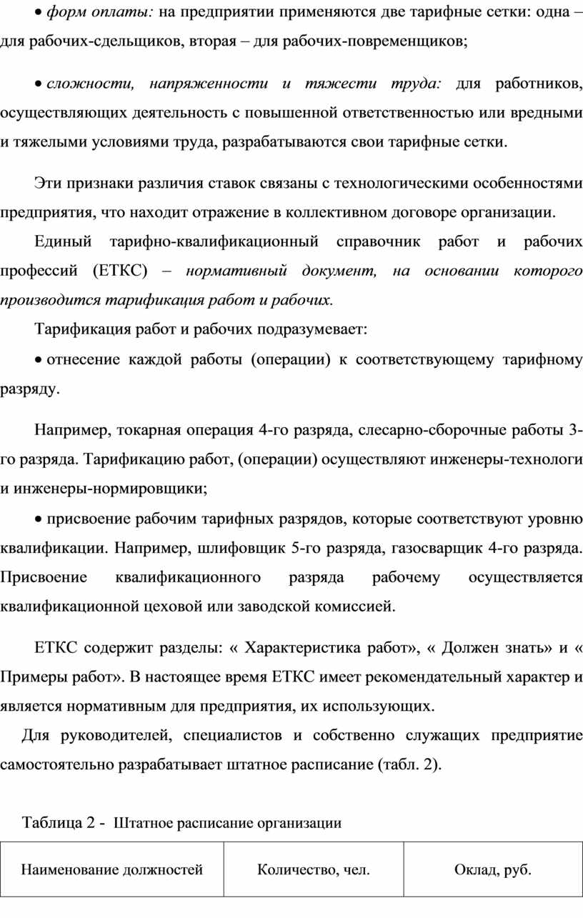 · форм оплаты: на предприятии применяются две тарифные сетки: одна – для рабочих-сдельщиков, вторая – для рабочих-повременщиков;