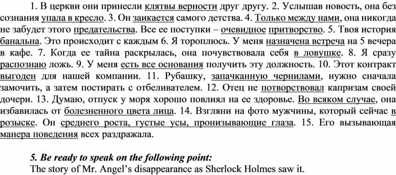1. В церкви они принесли клятвы верности друг другу. 2. Услышав новость, она без сознания упала в кресло. 3. Он заикается самого детства. 4. Только между нами, она никогда не забудет этого предательства. Все ее поступки – очевидное притворство. 5. Твоя история банальна. Это происходит с каждым 6. Я тороплюсь. У меня назначена встреча на 5 вечера в кафе. 7. Когда ее тайна раскрылась, она почувствовала себя в ловушке. 8. Я сразу распознаю ложь. 9. У меня есть все основания получить эту должность. 10. Этот контракт выгоден для нашей компании. 11. Рубашку, запачканную чернилами, нужно сначала замочить, а затем постирать с отбеливателем. 12. Отец не потворствовал капризам своей дочери. 13. Думаю, отпуск у моря хорошо повлиял на ее здоровье. Во всяком случае, она избавилась от болезненного цвета лица. 14. Взгляни на фото мужчины, который сейчас в розыске. Он среднего роста, густые усы, пронизывающие глаза. 15. Его вызывающая манера поведения всех раздражала.