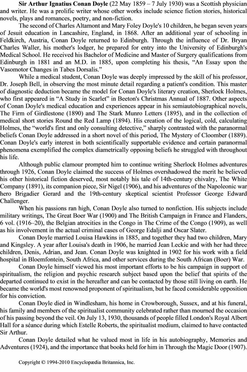Sir Arthur Ignatius Conan Doyle (22 May 1859 – 7 July 1930) was a Scottish physician and writer. He was a prolific writer whose other works include science fiction stories, historical novels, plays and romances, poetry, and non-fiction.