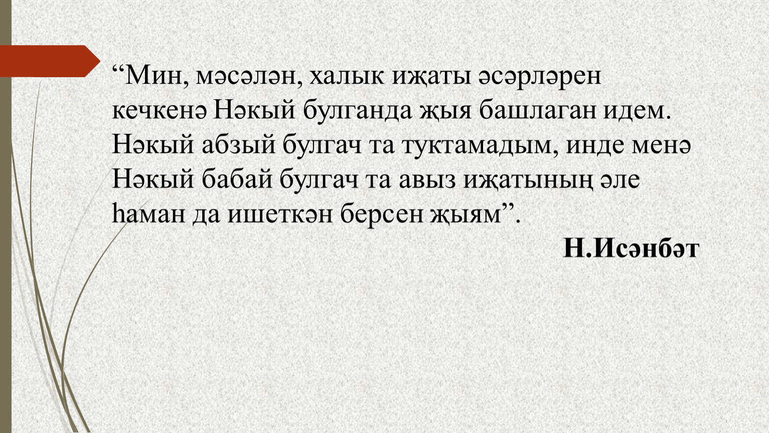 “Мин, мәсәлән, халык иҗаты әсәрләрен кечкенә Нәкый булганда җыя башлаган идем. Нәкый абзый булгач та туктамадым, инде менә Нәкый бабай булгач та авыз иҗатының әле һаман да ишеткән берсен җыям”.