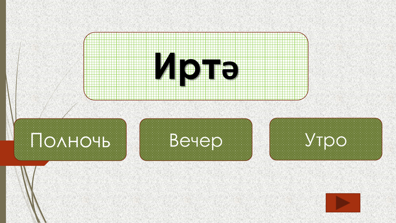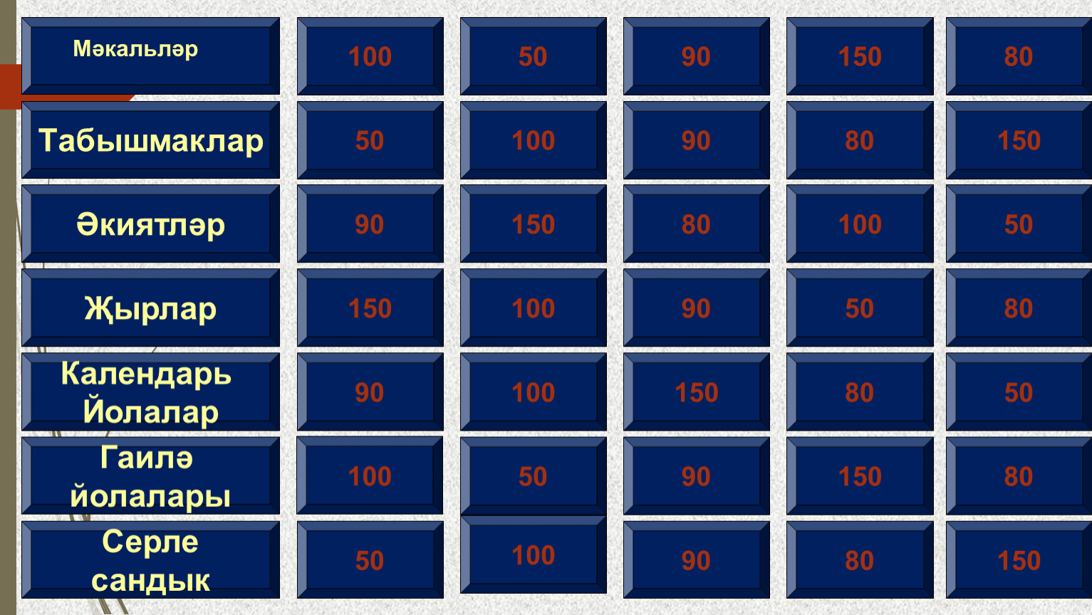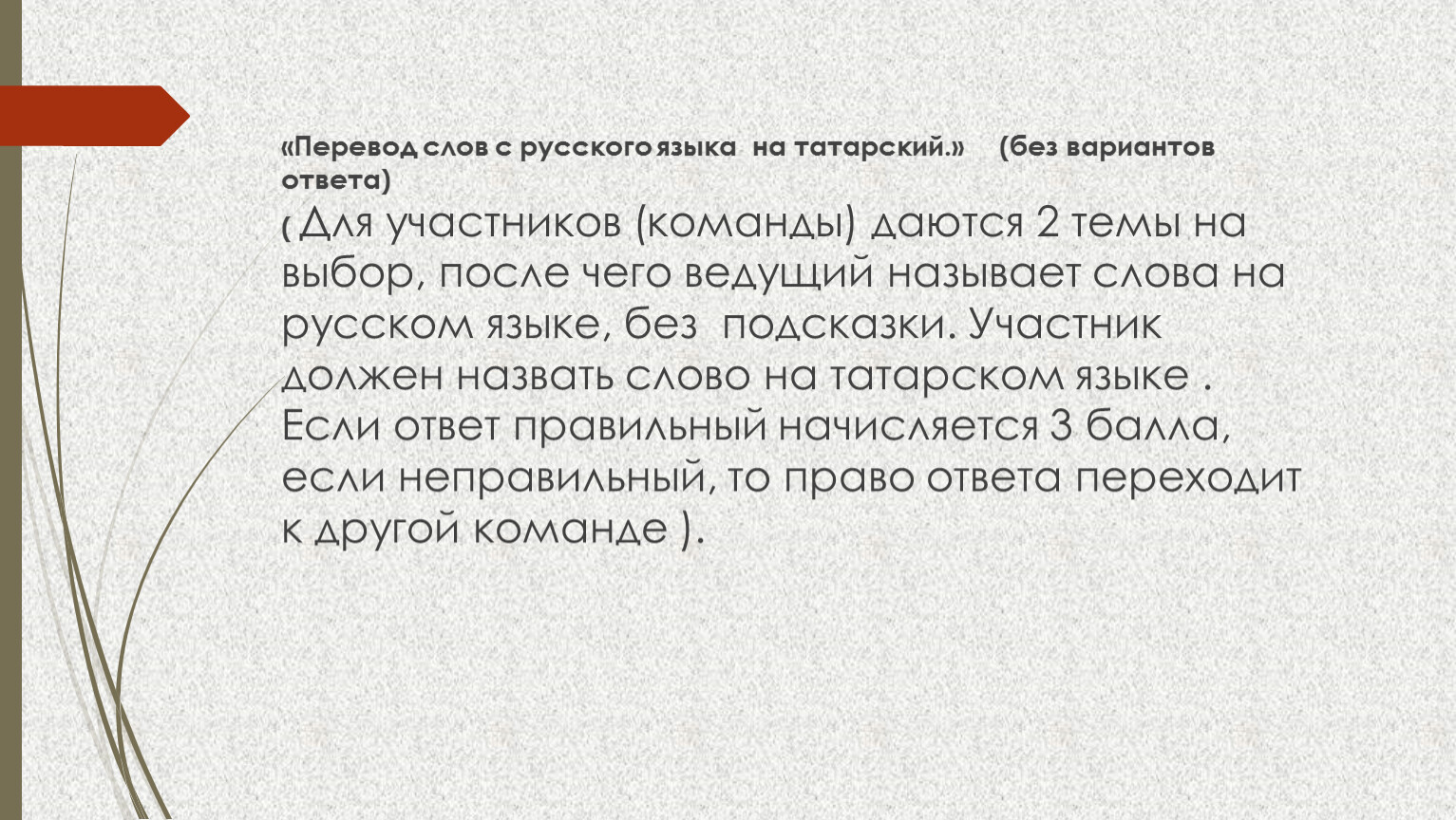 «Перевод слов с русского языка на татарский.» (без вариантов ответа)( Для участников (команды) даются 2 темы на выбор, после чего ведущий называет слова на русском языке, без подсказки. Участник должен назвать слово на татарском языке . Если ответ правильный начисляется 3 балла, если неправильный, то право ответа переходит к другой команде ).