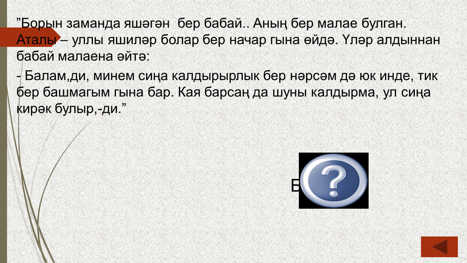 ”Борын заманда яшәгән бер бабай.. Аның бер малае булган. Аталы – уллы яшиләр болар бер начар гына өйдә. Үләр алдыннан бабай малаена әйтә: