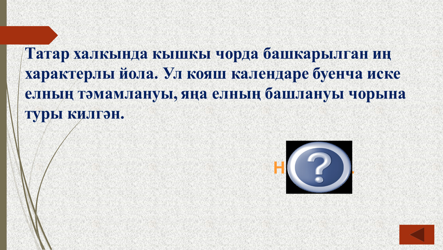 Татар халкында кышкы чорда башкарылган иң характерлы йола. Ул кояш календаре буенча иске елның тәмамлануы, яңа елның башлануы чорына туры килгән.