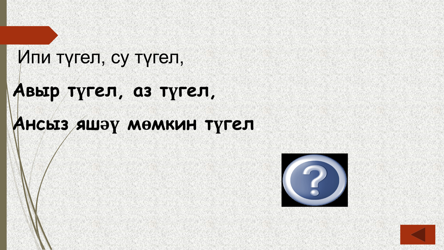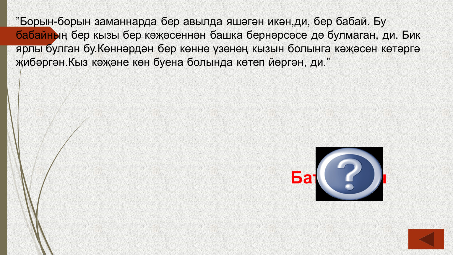” Борын –борын заманда, кәҗә команда, әби-бабай тумас борын, әти белән икәү генә торган чагында, бар иде, ди, бер карт белән карчык.Аларның балалары юк иде,шуңар кайгылары бик зур иде, ди..”