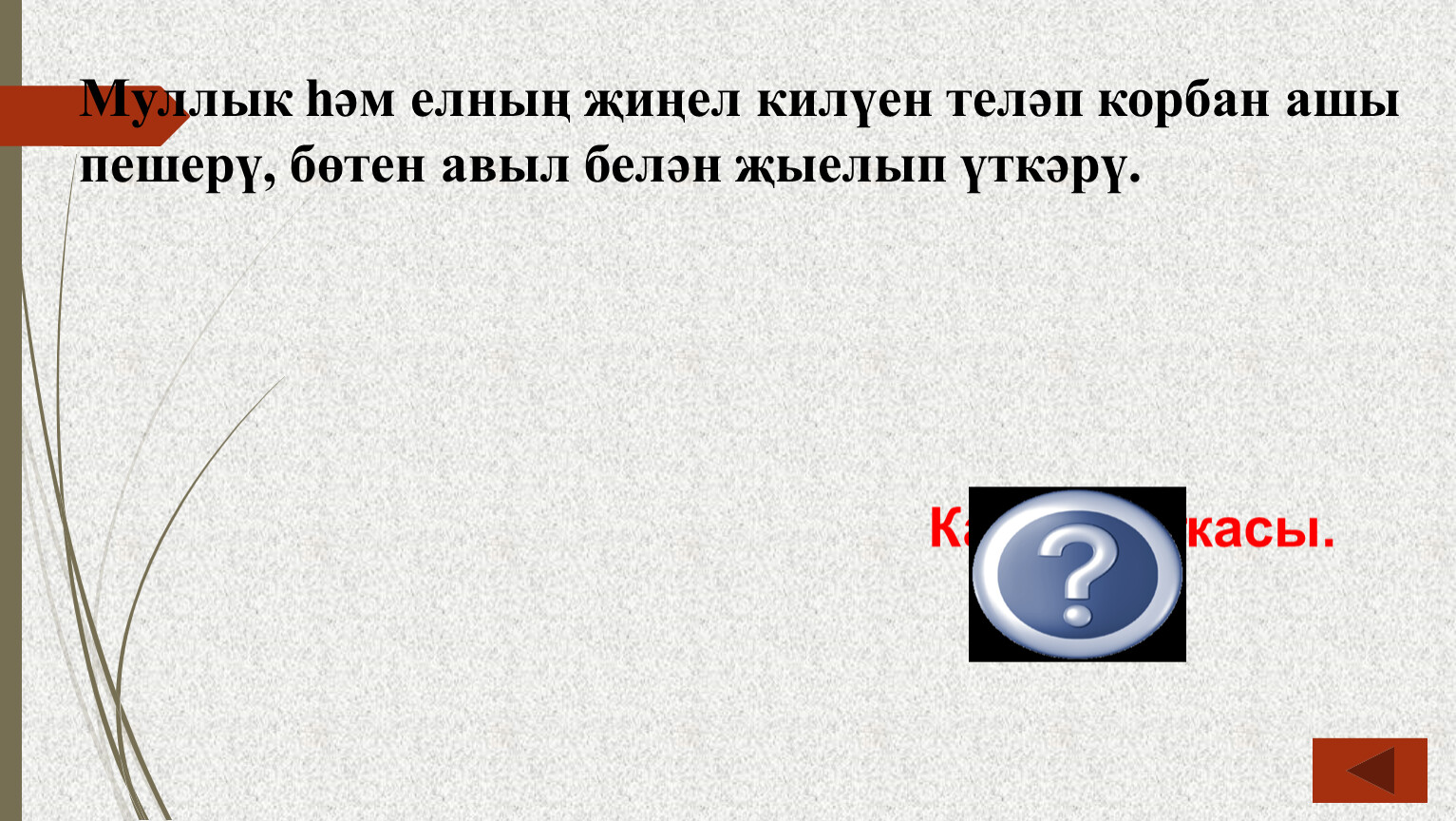 Муллык һәм елның җиңел килүен теләп корбан ашы пешерү, бөтен авыл белән җыелып үткәрү.