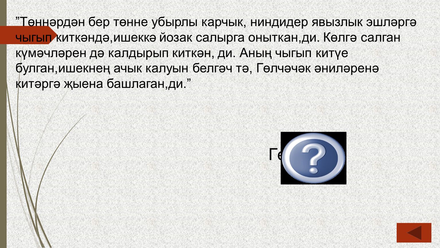 ”Төннәрдән бер төнне убырлы карчык, ниндидер явызлык эшләргә чыгып киткәндә,ишеккә йозак салырга оныткан,ди. Көлгә салган күмәчләрен дә калдырып киткән, ди. Аның чыгып китүе булган,ишекнең ачык калуын белгәч тә, Гөлчәчәк әниләренә китәргә җыена башлаган,ди.”