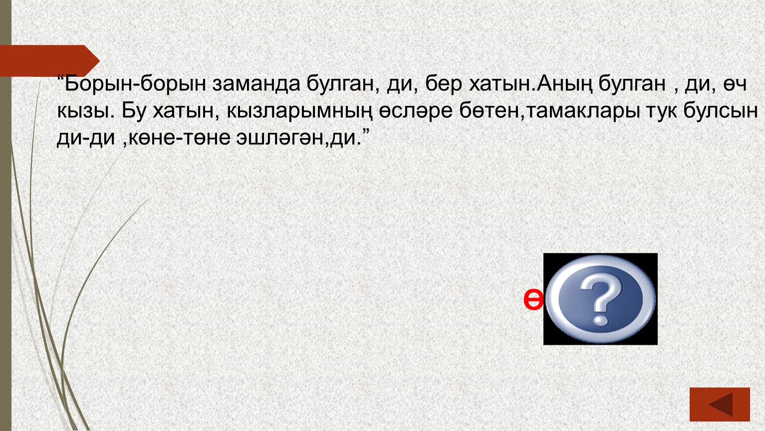 “Борын-борын заманда булган, ди, бер хатын.Аның булган , ди, өч кызы. Бу хатын, кызларымның өсләре бөтен,тамаклары тук булсын ди-ди ,көне-төне эшләгән,ди.”