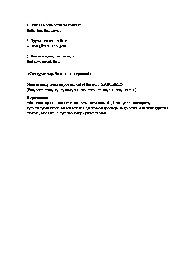 (мақал ішіндегі белгілі бір сөздің үш тілде аудармасын айту керек)